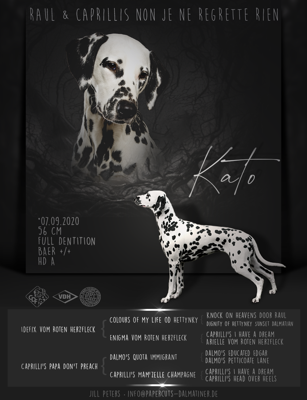 „w/s, 19 Monate, mittelgroße Hündin, mittelstarke Knochen, vorzüglicher Kopf, dkl. braune Augen, langer Hals, gerade feste Oberlinie, leicht steil im Oberarm, vorne & hinten korrekt gewinkelt, vorzüglich mittelstark getupft mit klar abgegrenzten lackschwarzen Tupfen, aufmerksames Wesen, vorzüglich fließendes raumgreifendes Gangwerk“
