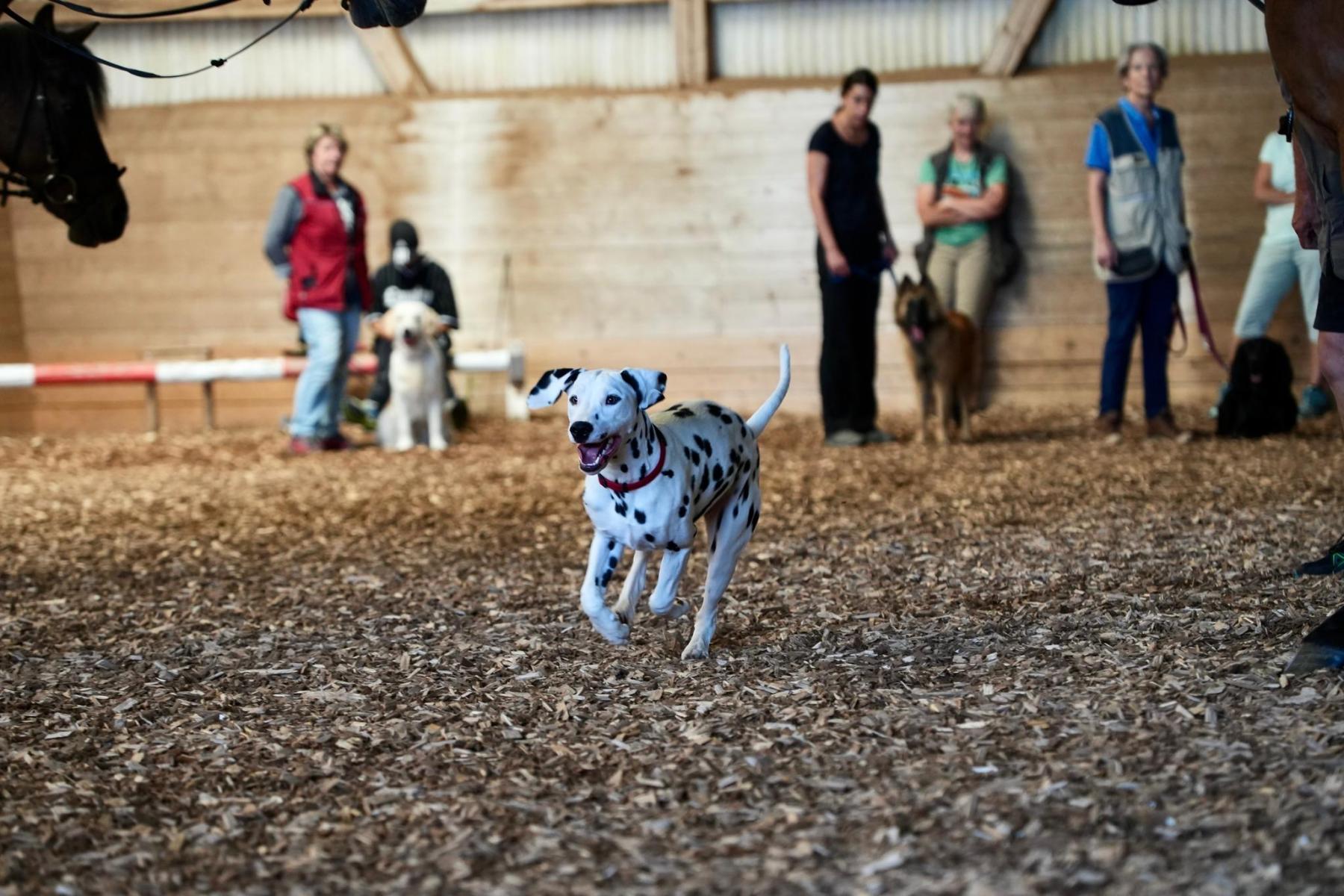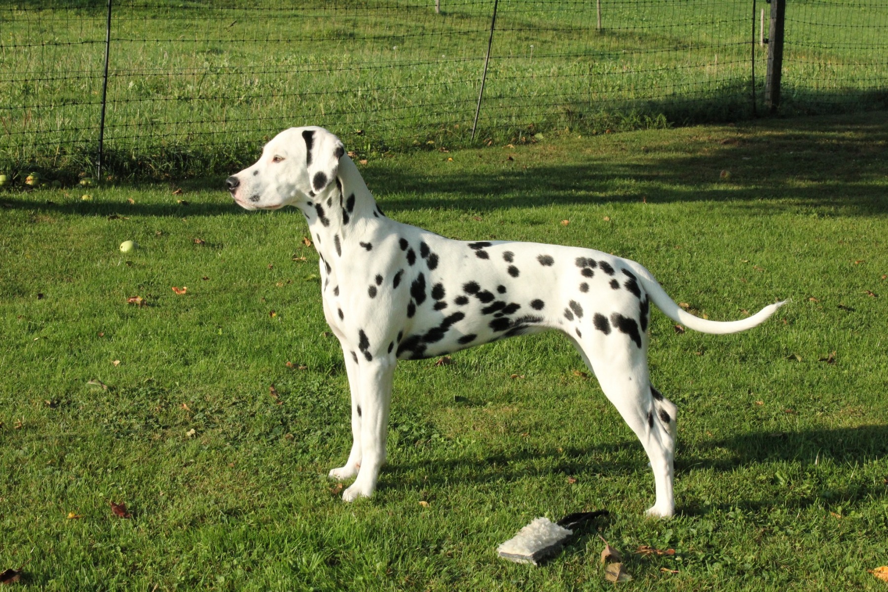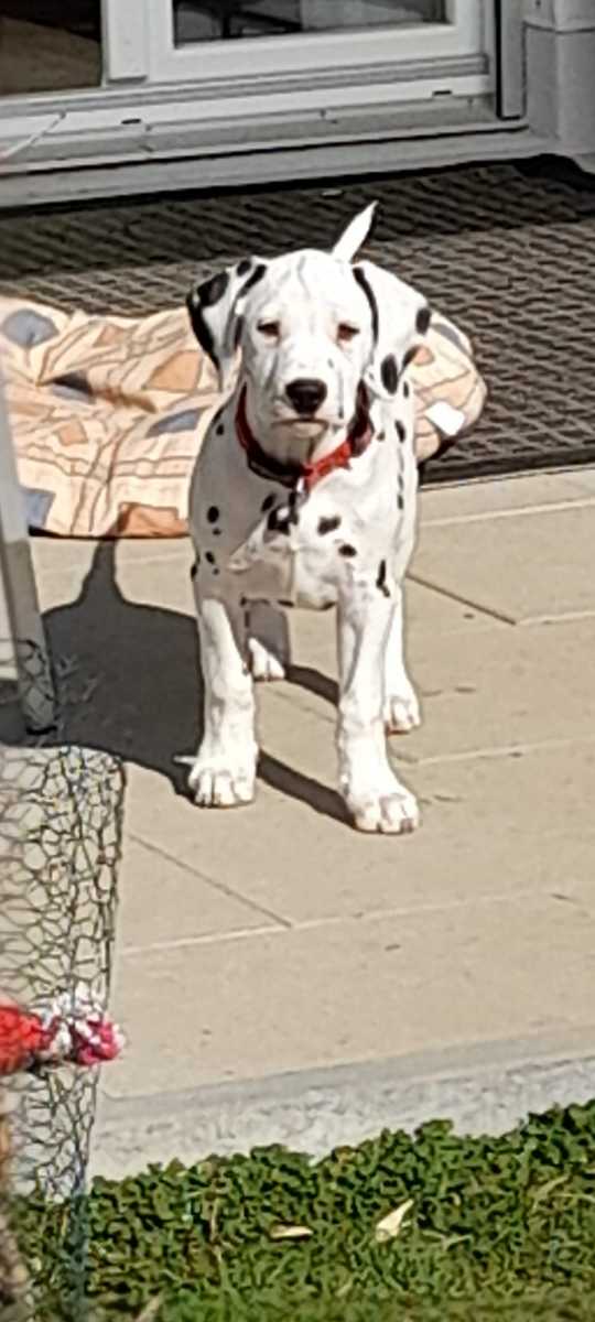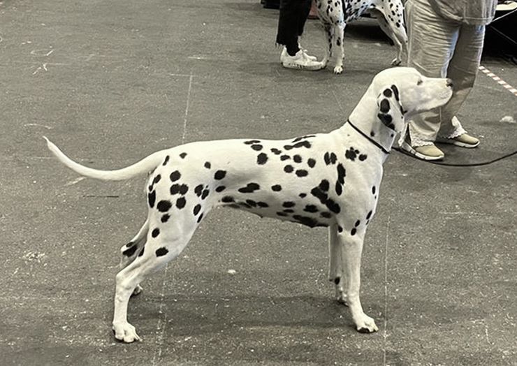 8 Monate, Scherengebiss, weiblicher Kopf, Augensaum rechts nicht komplett, Ohren gut angesetzt und getragen, gut gewinkelte Schultern, etwas steil im Oberarm, prima Vorbrust, starke Knochen, gute Füsse, gut gewinkelte Hinterhand, perfekt getupft und pigmentiert, gut angesetzte Rute, im Gehen etwas eng hinten, Rücken müsste noch fester werden, Rute hoch getragen