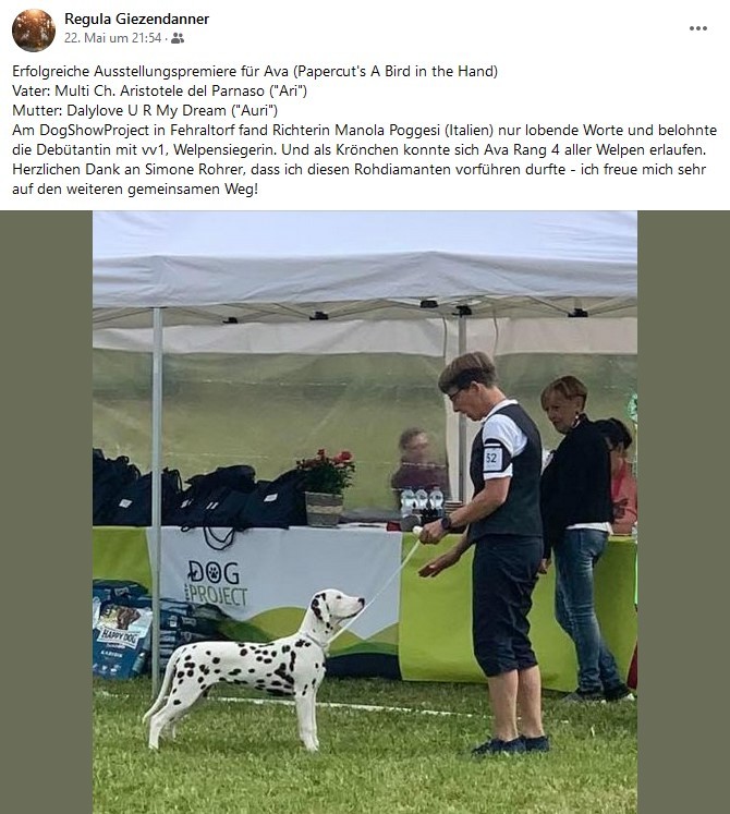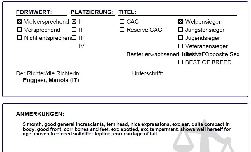 | 21.05.2022 | Fehraltorf (CH) | Welpen | Manola Poggesi (I) | vv/vp1, Welpensieger |